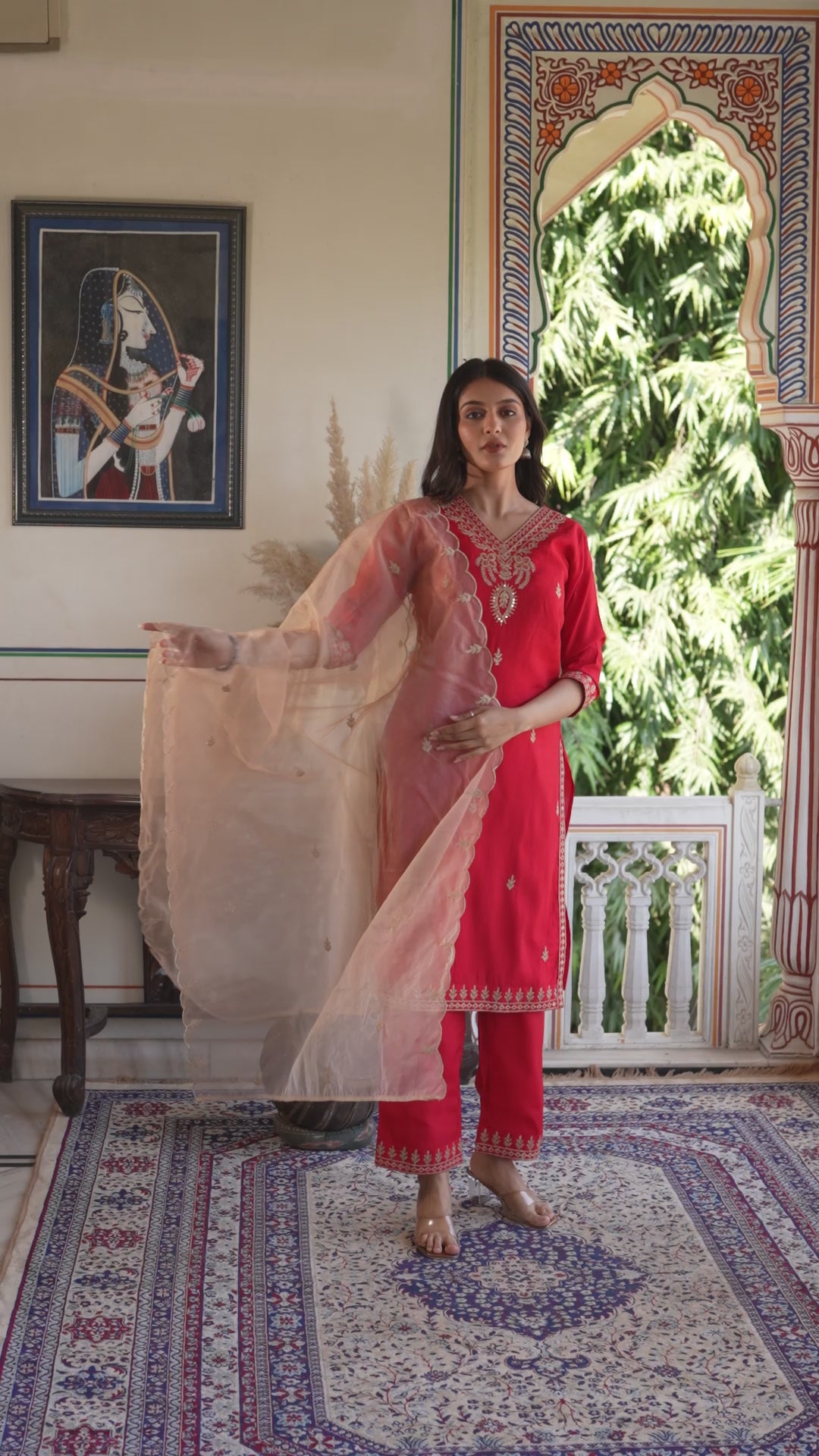 Modal Chanderi embroidered kurta pant dupatta set.